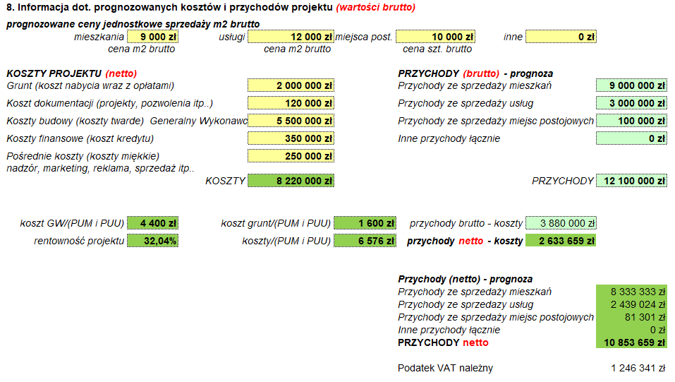 Przykładowa inwestycja deweloperska na 8 lokali mieszkalnych: