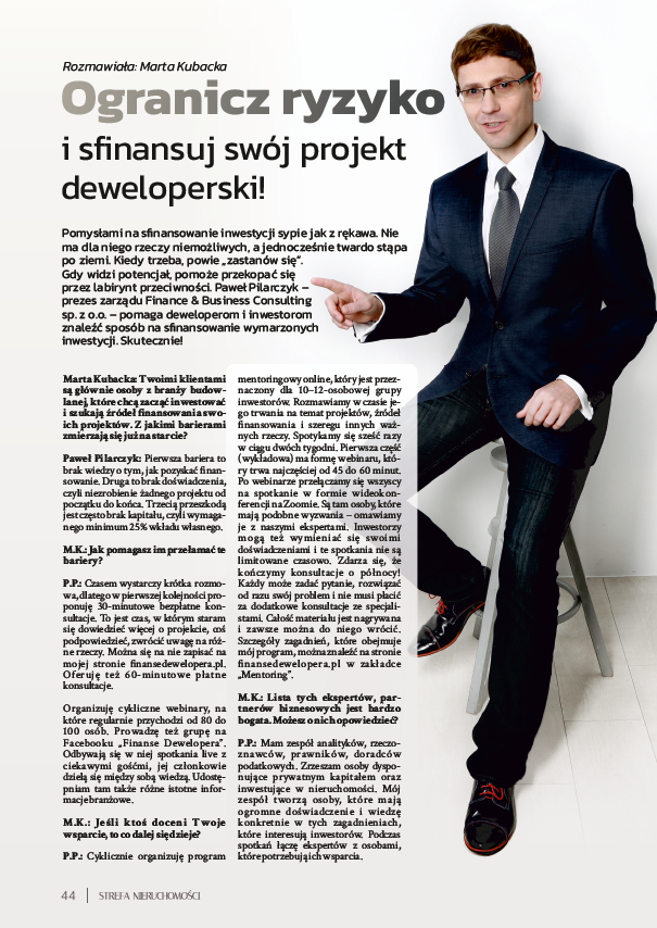 Współpracuję z Bankami, Funduszami oraz Inwestorami Prywatnymi. Zajmuję się Pozyskiwaniem Finansowania i Komercjalizacją Inwestycji deweloperskich. Jestem przedsiębiorcą i doświadczonym menadżerem. Rozwijam własne firmy w branżach finansów i nieruchomości.
